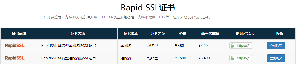 价格亲民,可以让您节约很多成本。下图是环度网信对 RapidSSL证书的定价,点击图片联系环度网信客服,价格还能再优惠。