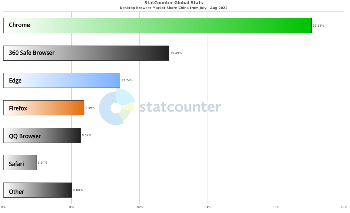 上面这个截图来自 Chrome 浏览器对没有安装SSL证书的网站在被打开的时候展示的拦截。环度网信小编在 Statcounter 查询到的市占率统计数据中(仅供参考),2022年 7 月到 8 月,Chrome 浏览器在中国PC桌面浏览器的市场份额占据 36% 以上,这是一个巨大的用户群体,作为网站运营方,不得不考虑这种不友好的拦截带给网站的流量损失。
