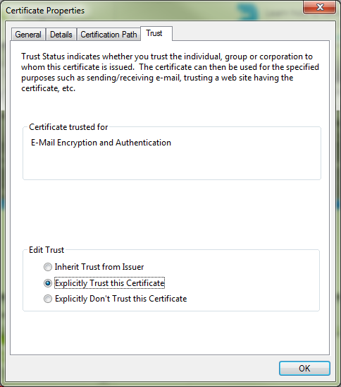单击信任选项卡,然后选择明确信任此证书: